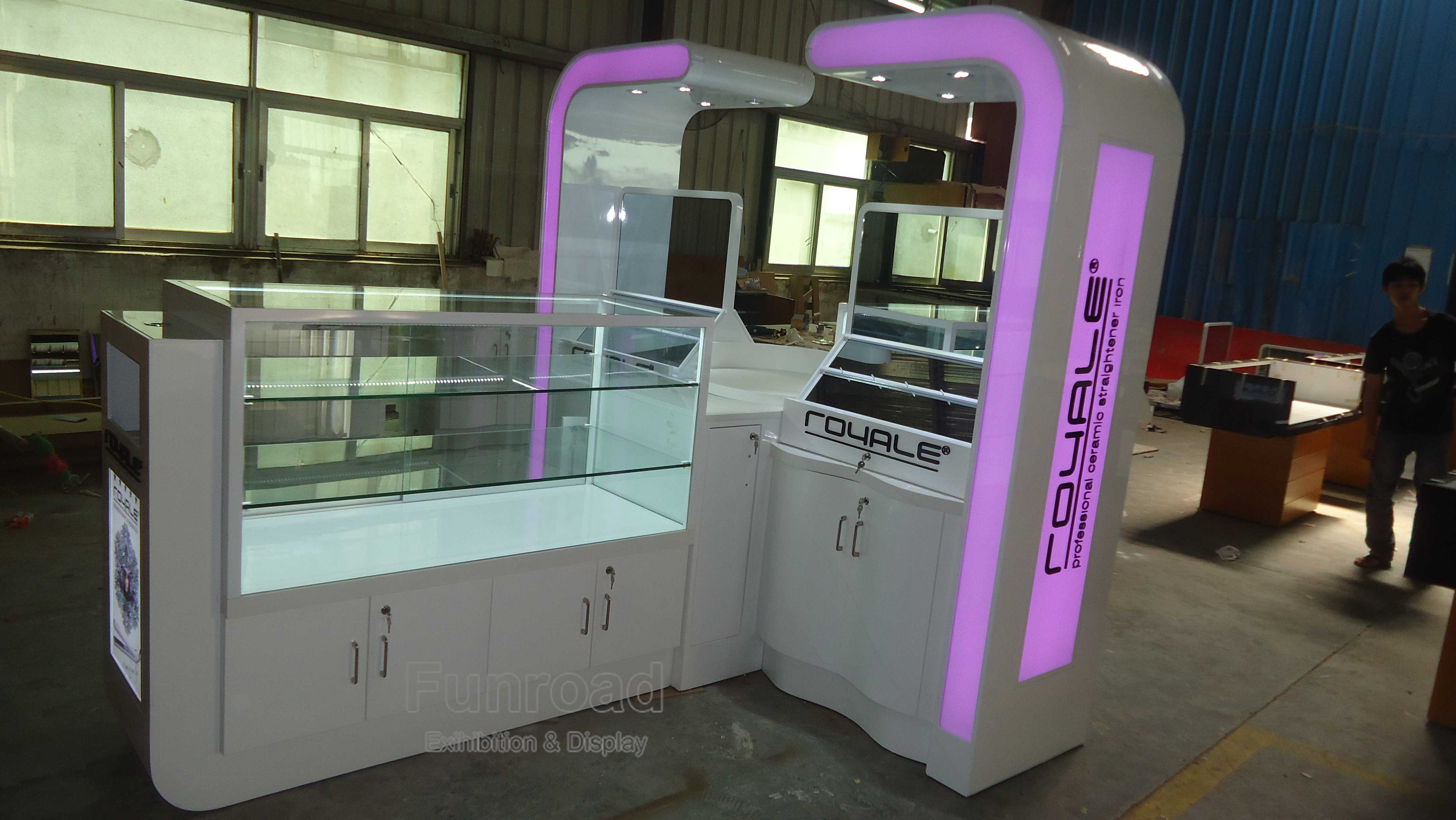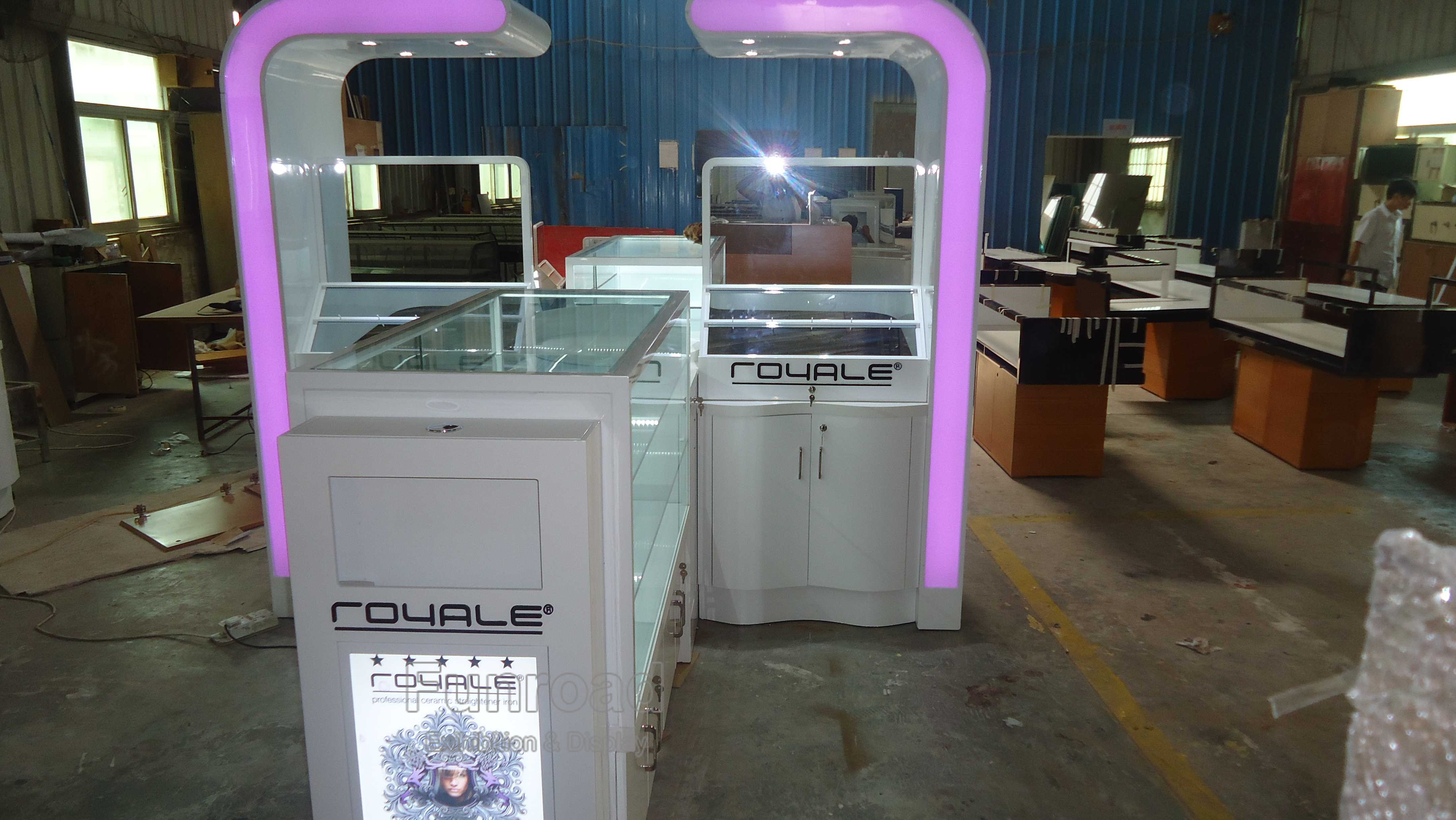 在美國做生意的MR李找到我們,要我們為設計制作適合商場環境的產品銷售柜臺。通過與客戶的溝通,明確了需要展示的產品類型,商場面積位置構造,再結合客戶的需求,我們進行了專業化的設計。現這款精美的商場化妝品展柜現已設計制作完成,下面我們一起來看這款精美的商場展柜吧。