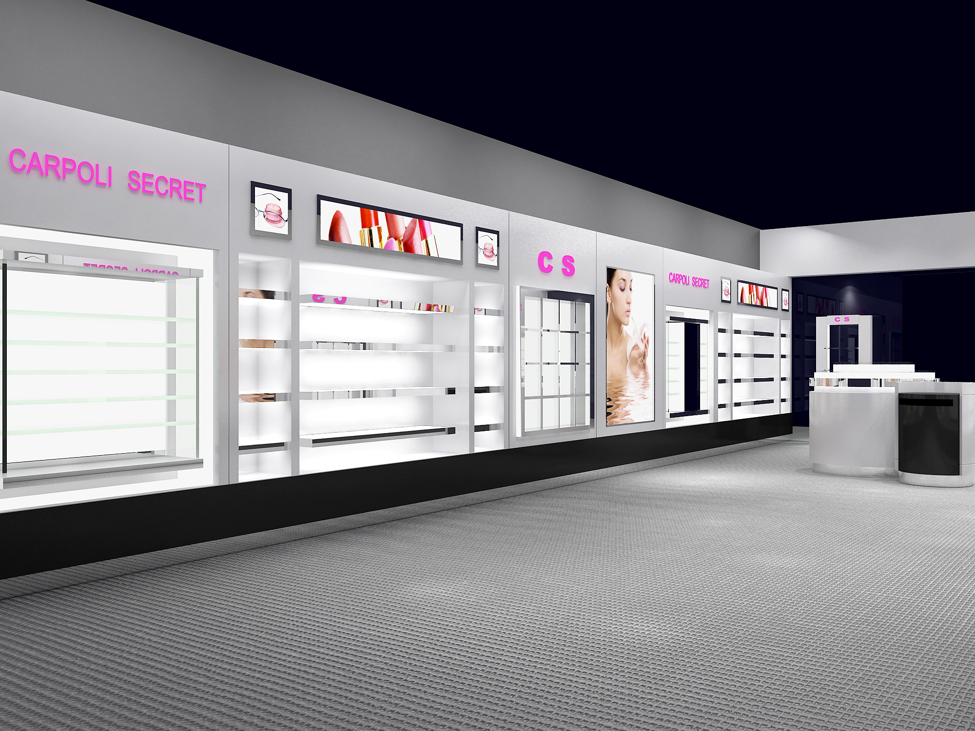 化妝品展柜整體風格統一。為達到展示效果,體現品牌設計理念,從整體LOGO設計到店內擺放,都要體現設計與展示主旨意圖。
