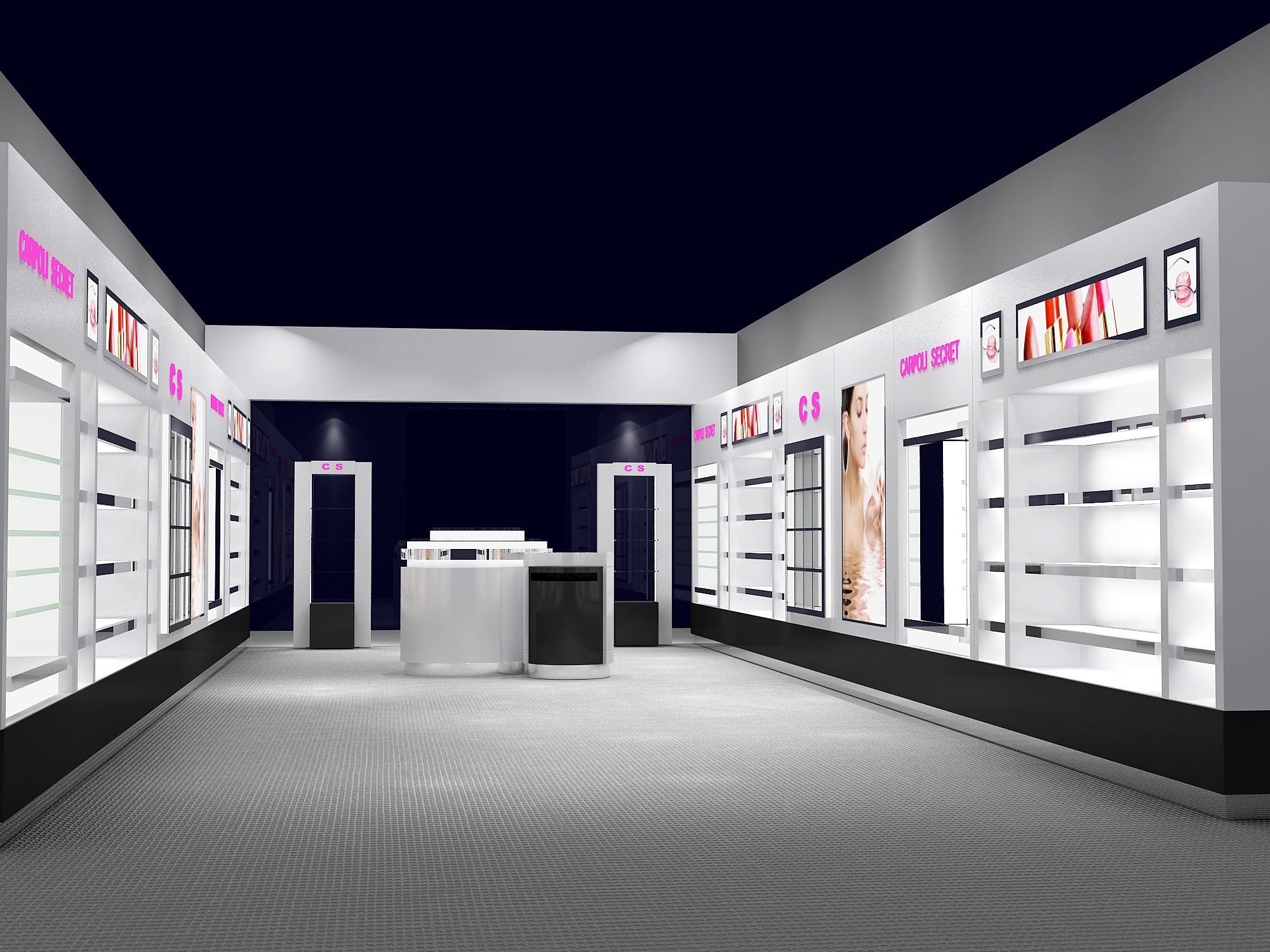 合理的空間設計使消費者有充足的自由空間,自主選擇產品,柔和的燈光設計營造出化妝品展示效果的氣氛。中間位置可放置沙發或者作為體驗區打造出休閑+愉悅的購物環境。
